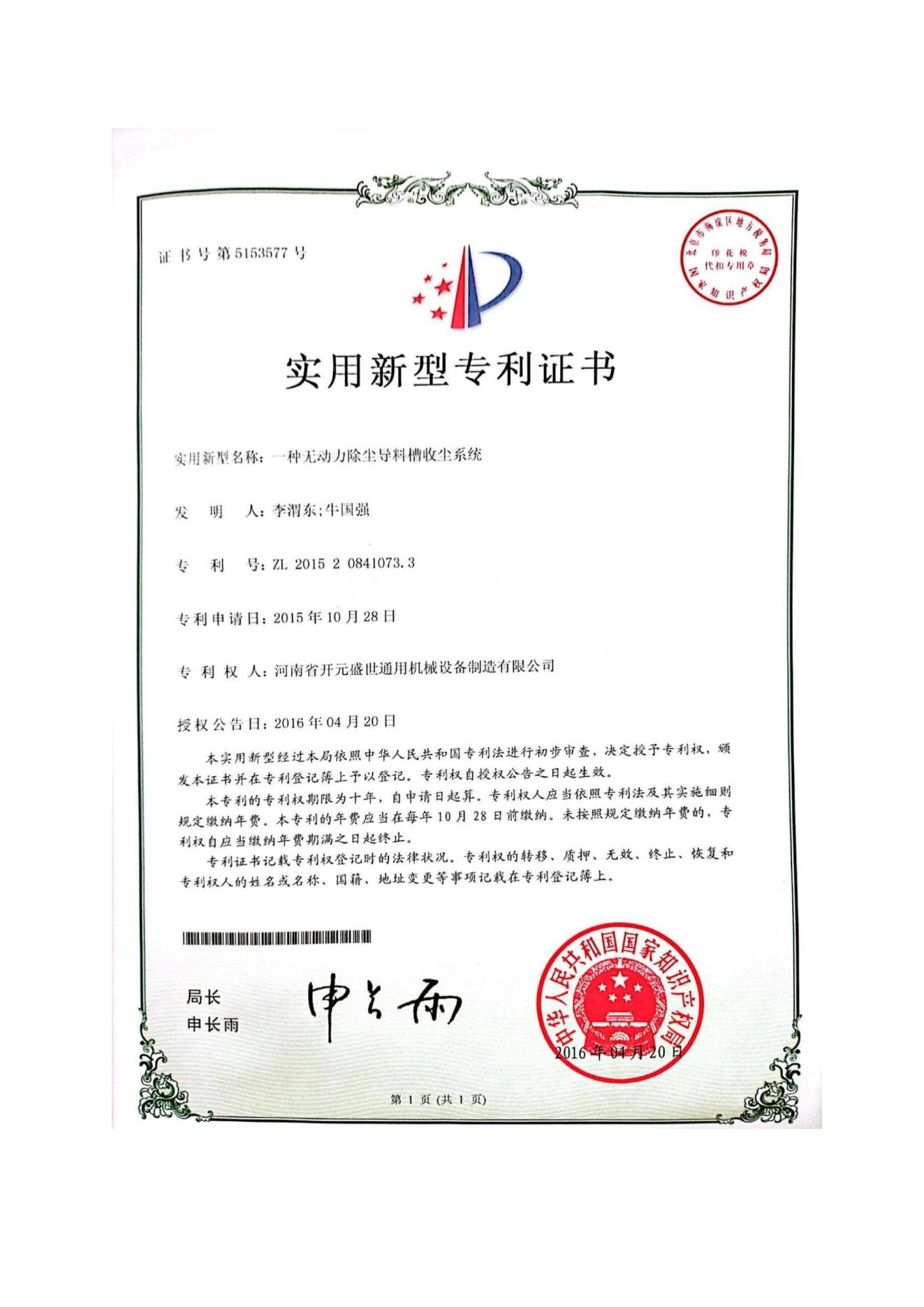 我司研发的“一种无动力除尘导料槽收尘系统”成功获得国家知识产权局实用新型专利授权(专利号:ZL 2015 2 0841073.3)。该系统依托流体力学与结构优化实现无动力除尘,在降低能耗、简化运维的同时,显著提升导料槽区域粉尘抑制效果。